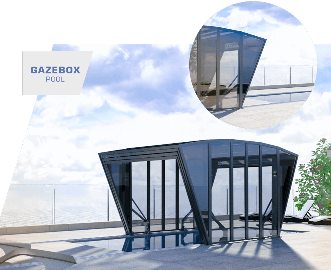 レールを装備したプール用のGazeBox。サイズや色はお選びいただけます。